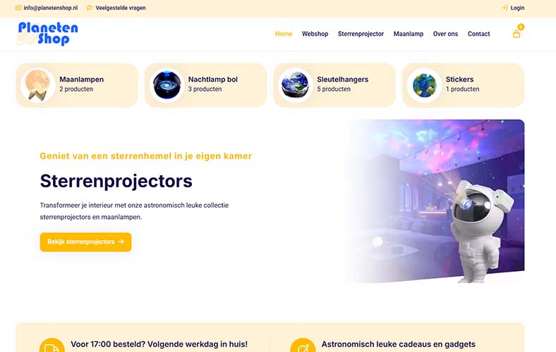 Website met webshop voor de verkoop van leuke items voor fans van astronomie. Bezoekers betalen via iDeal. Het systeem beschikt over een uitgebreide backend.